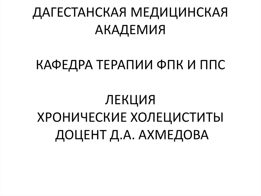 1. ДАГЕСТАНСКАЯ МЕДИЦИНСКАЯ АКАДЕМИЯ КАФЕДРА ТЕРАПИИ ФПК И ППС ЛЕКЦИЯ ХРОНИЧЕСКИЕ ХОЛЕЦИСТИТЫ ДОЦЕНТ Д.А. АХМЕДОВА