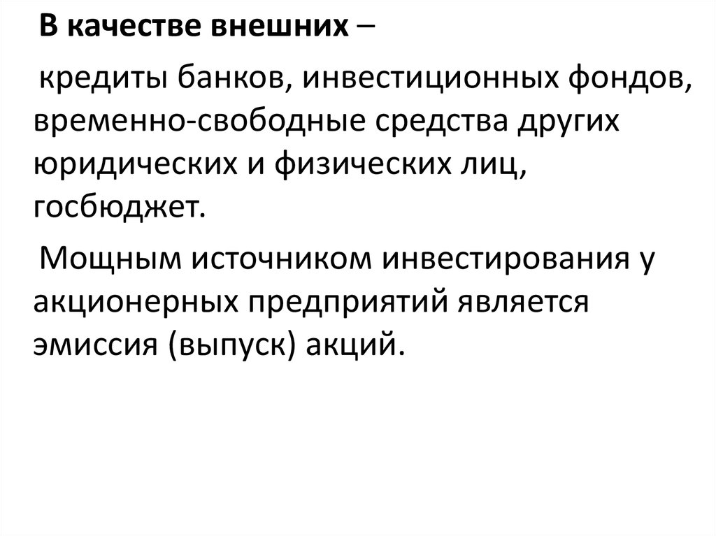 В качестве внешних –кредиты банков, инвестиционных фондов,