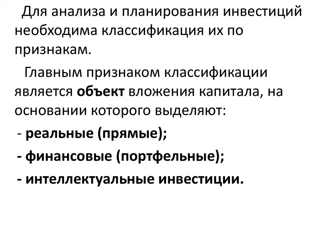 Для анализа и планирования инвестицийнеобходима классификация их по