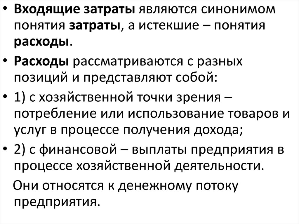 • Затраты принято разделять на входящие иистекшие.
