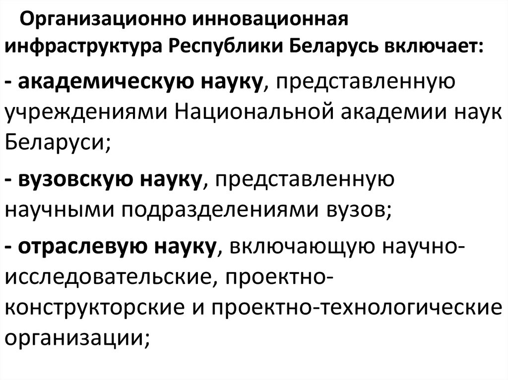 Организационно инновационнаяинфраструктура Республики Беларусь включает: