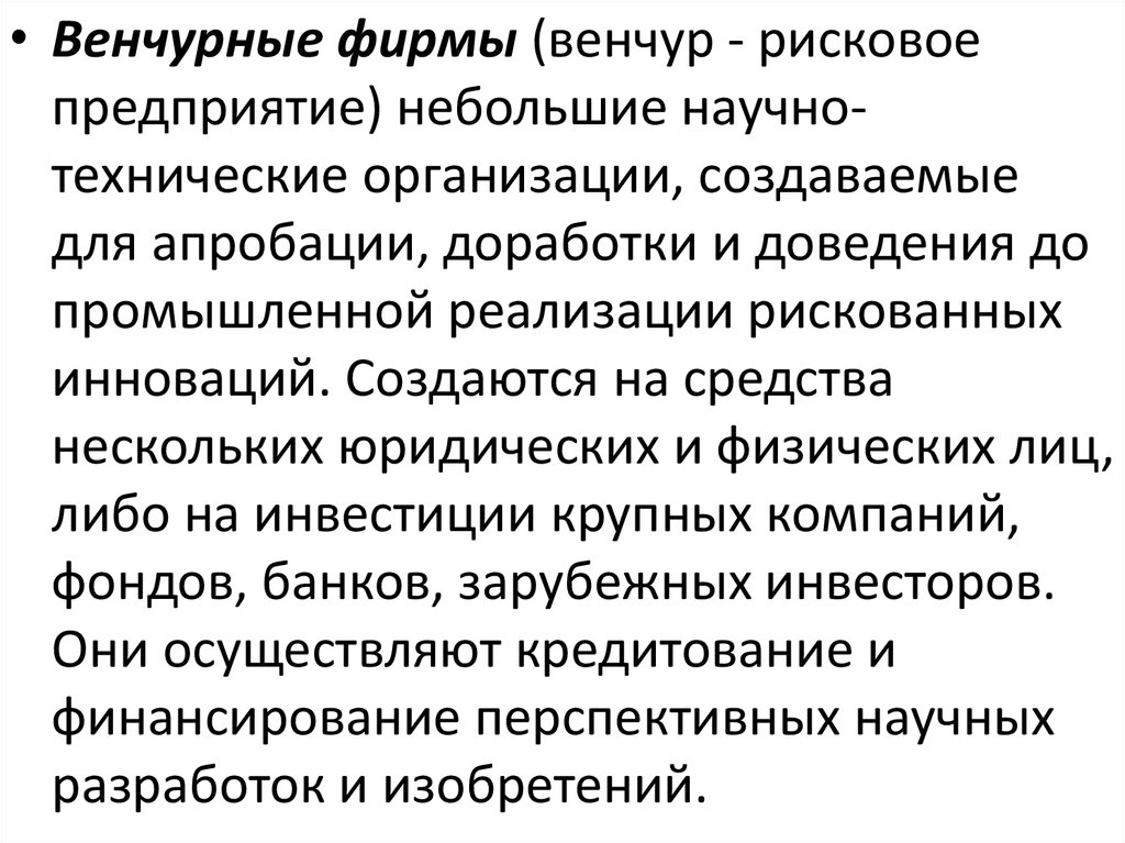 • Венчурные фирмы (венчур - рисковоепредприятие) небольшие научнотехнические организации, создаваемые