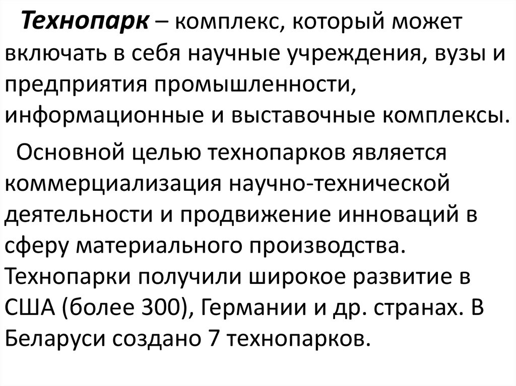 Технопарк – комплекс, который можетвключать в себя научные учреждения, вузы и