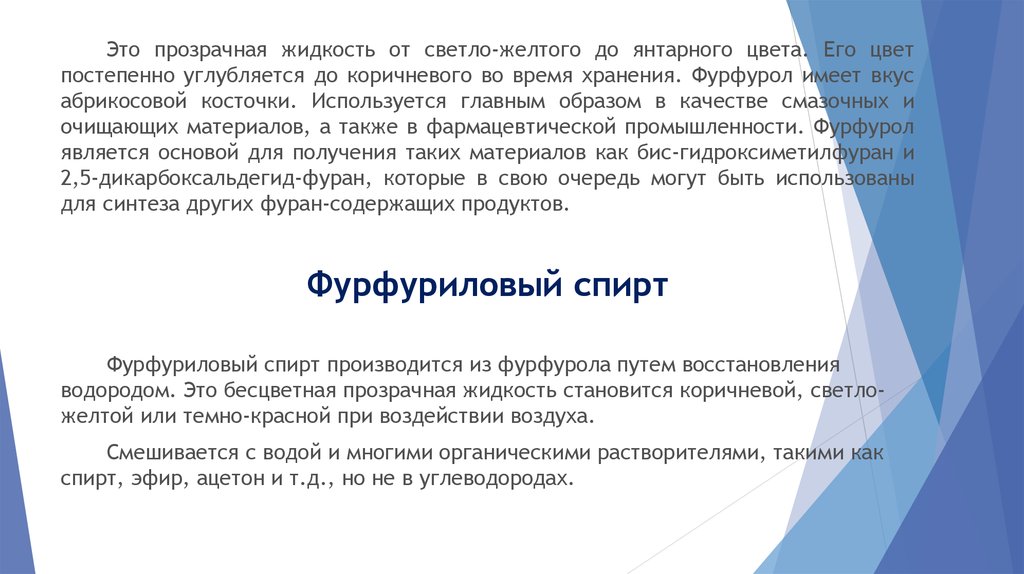 очищающих материалов, а также в фармацевтической промышленности. Фурфурол