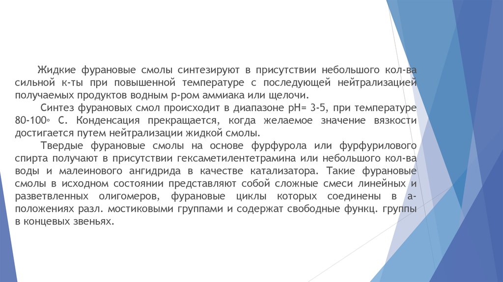 Синтез фурановых смол происходит в диапазоне рН= 3-5, при температуре