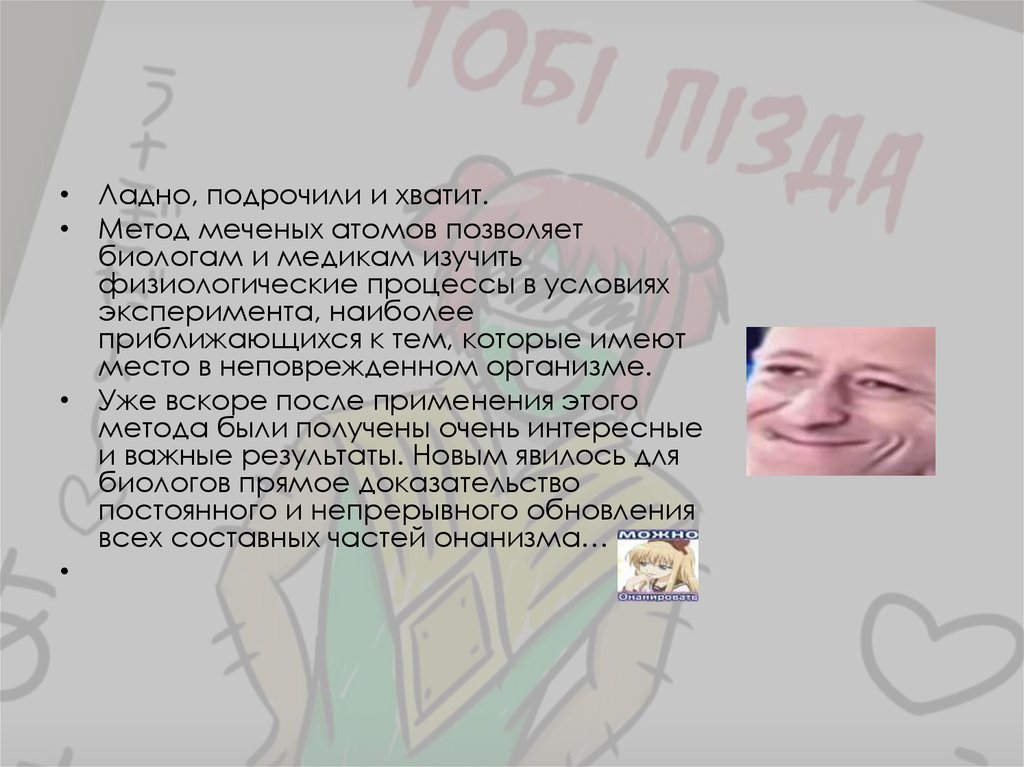 • Ладно, подрочили и хватит.• Метод меченых атомов позволяет