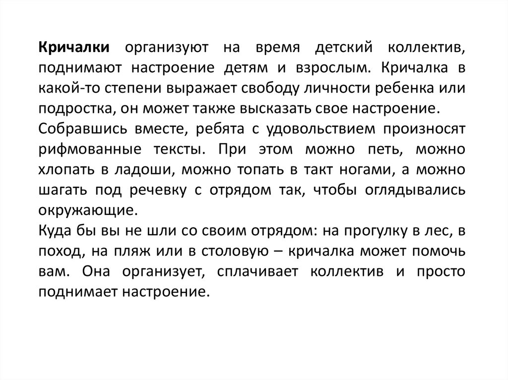 Кричалки организуют на время детский коллектив,поднимают настроение детям и взрослым. Кричалка в