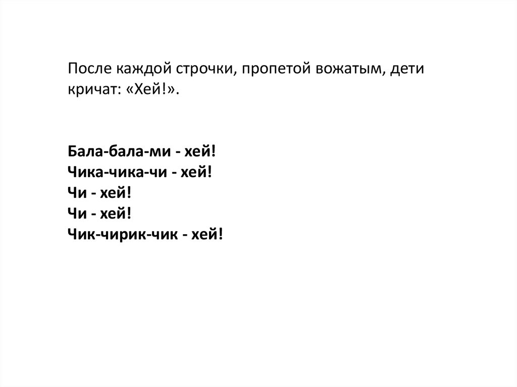После каждой строчки, пропетой вожатым, детикричат: «Хей!».