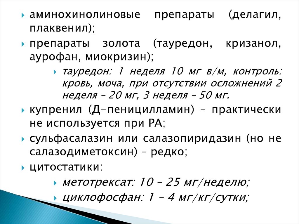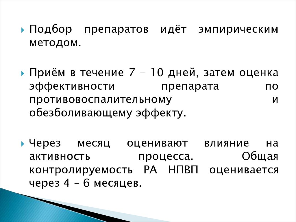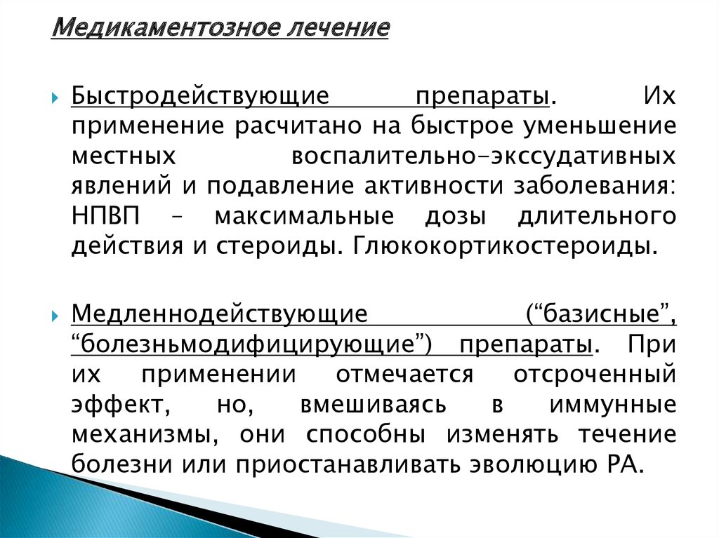 Принципы лечения:В ранней стадии РА, т.е. при воспалительноэкссудативных явлениях – назначают г.о. НПВП.