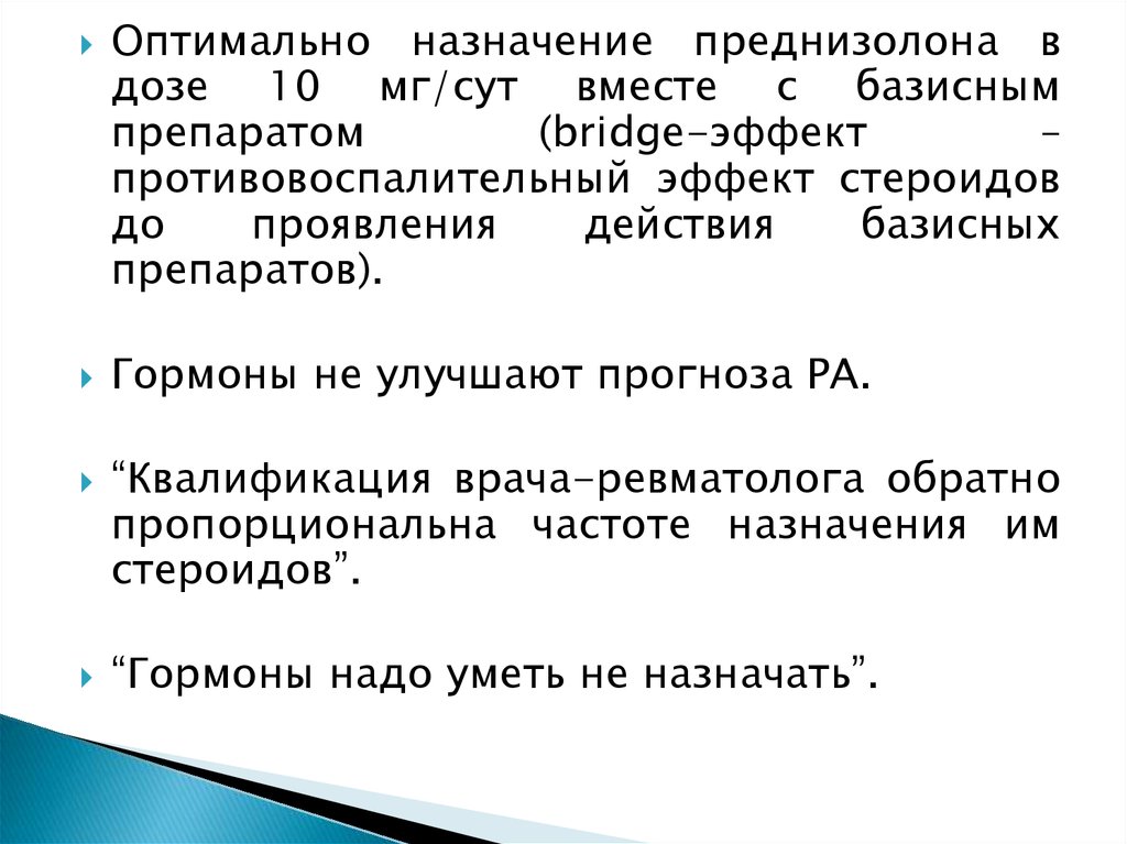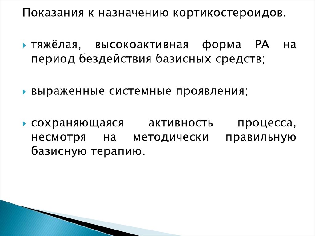 Показания к назначению кортикостероидов.тяжёлая, высокоактивная форма РА