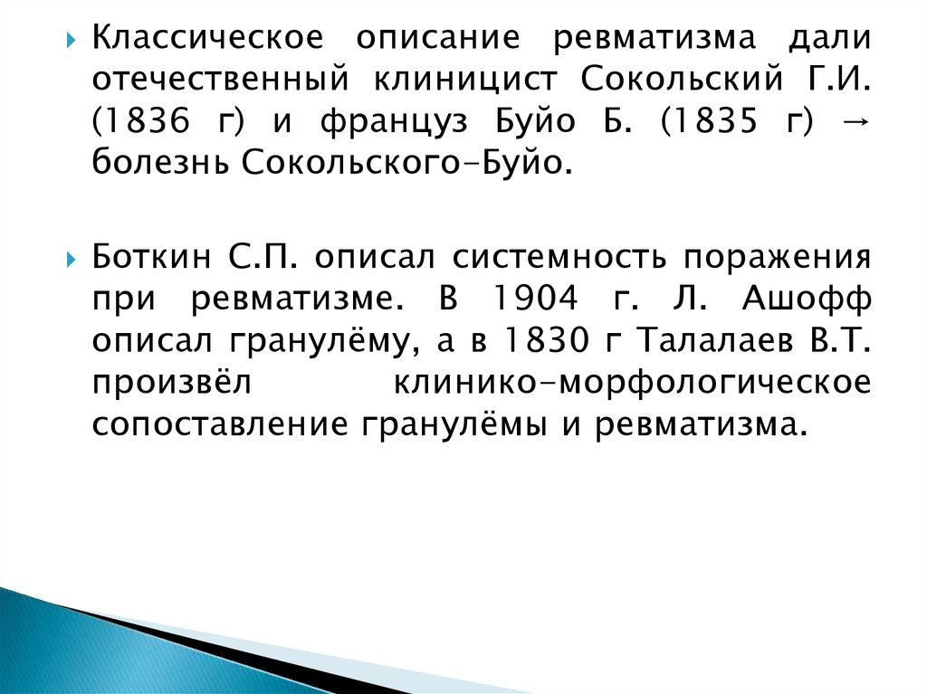 Классическое описание ревматизма далиотечественный клиницист Сокольский Г.И.