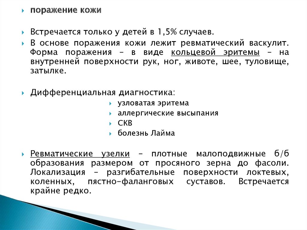 (мигрирующий полиартрит), мозге (хорея) и коже
