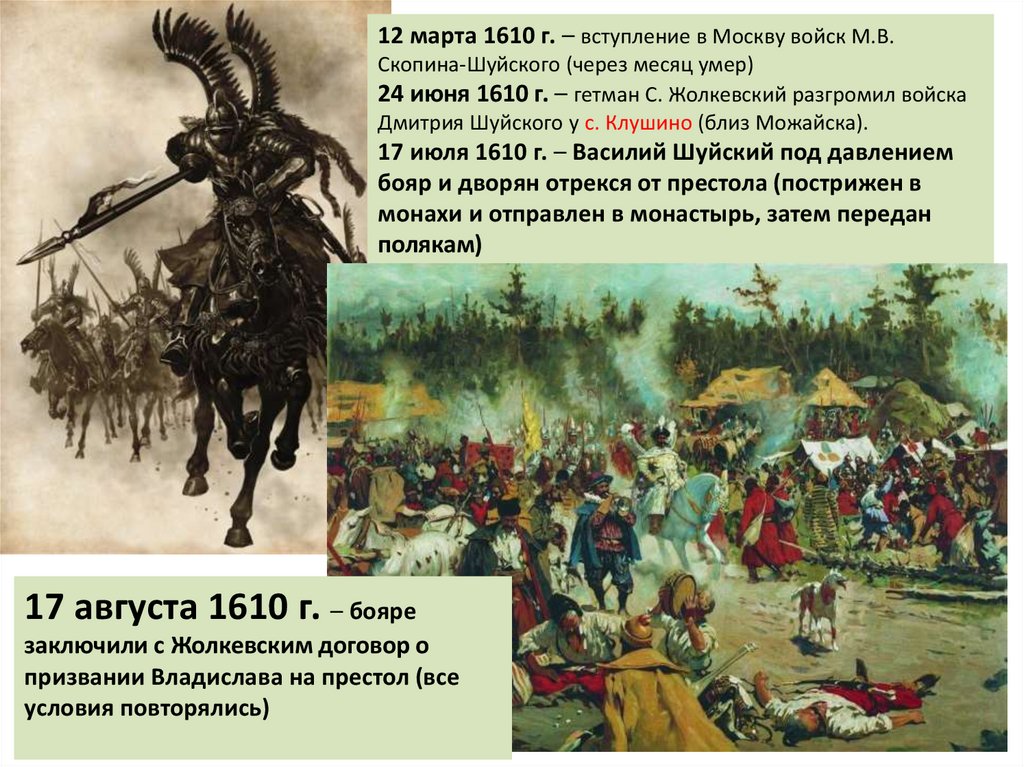 12 марта 1610 г. – вступление в Москву войск М.В.Скопина-Шуйского (через месяц умер)