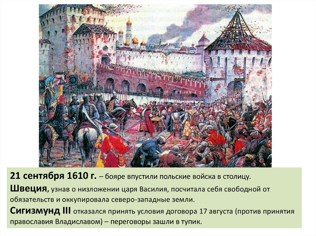 21 сентября 1610 г. – бояре впустили польские войска в столицу.Швеция, узнав о низложении царя Василия, посчитала себя свободной от