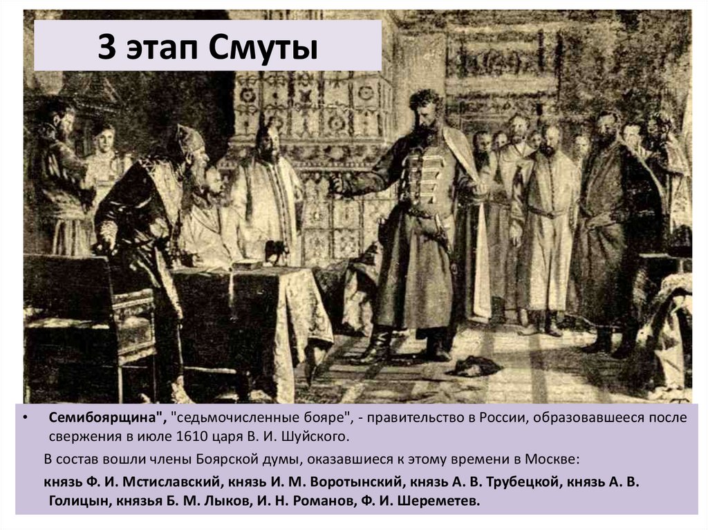 3 этап СмутыСемибоярщина", "седьмочисленные бояре", - правительство в России, образовавшееся после