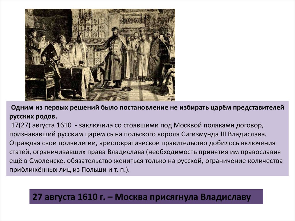 17(27) августа 1610 - заключила со стоявшими под Москвой поляками договор,