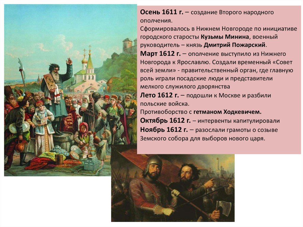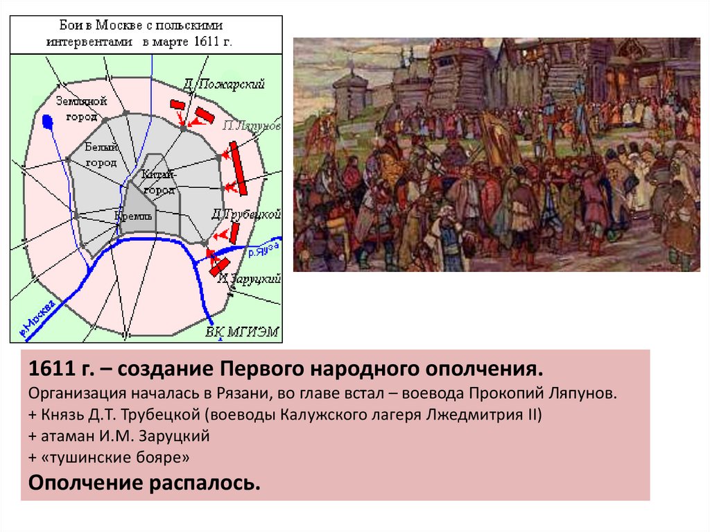1611 г. – создание Первого народного ополчения.Организация началась в Рязани, во главе встал – воевода Прокопий Ляпунов.