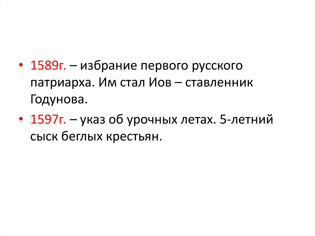 • 1589г. – избрание первого русскогопатриарха. Им стал Иов – ставленник