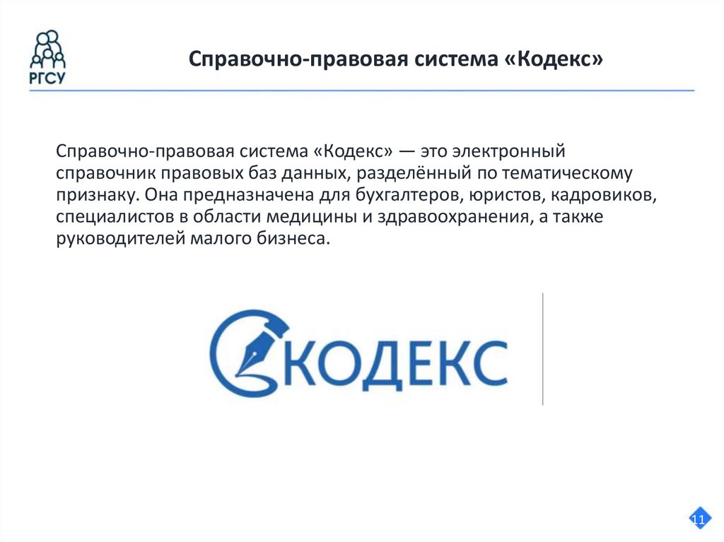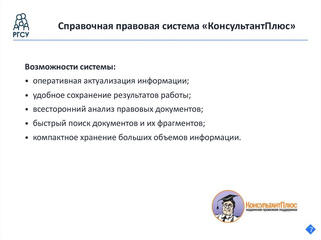 Справочная правовая система «КонсультантПлюс»Возможности системы:
