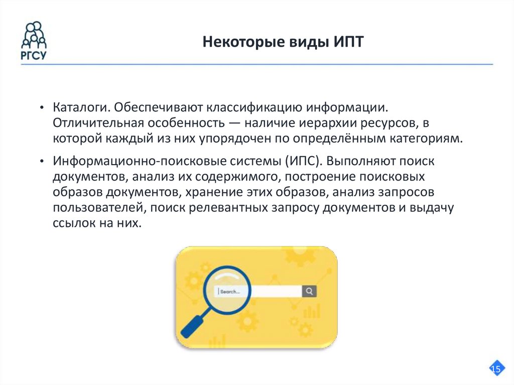 Некоторые виды ИПТ• Каталоги. Обеспечивают классификацию информации.