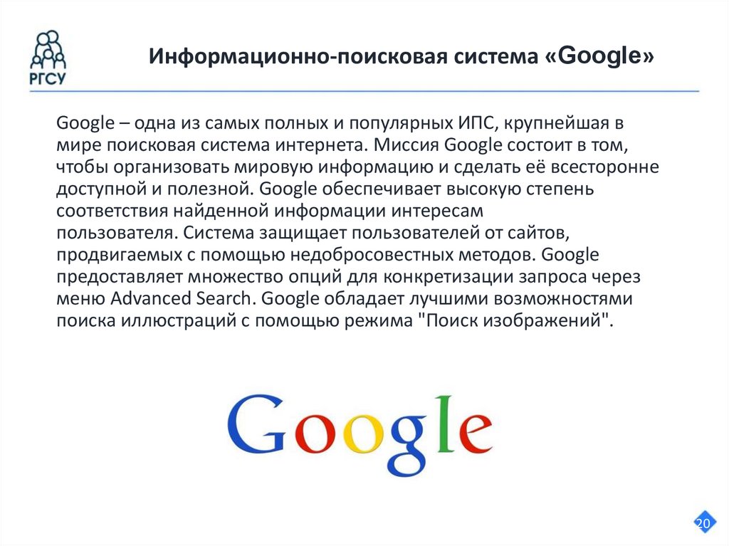 Информационно-поисковая система «Google»Google – одна из самых полных и популярных ИПС, крупнейшая в
