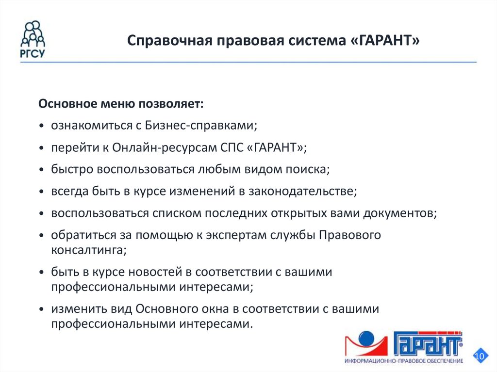 Справочная правовая система «ГАРАНТ»Основное меню позволяет: