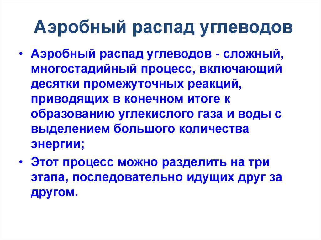 • Аэробный распад углеводов - сложный,многостадийный процесс, включающий