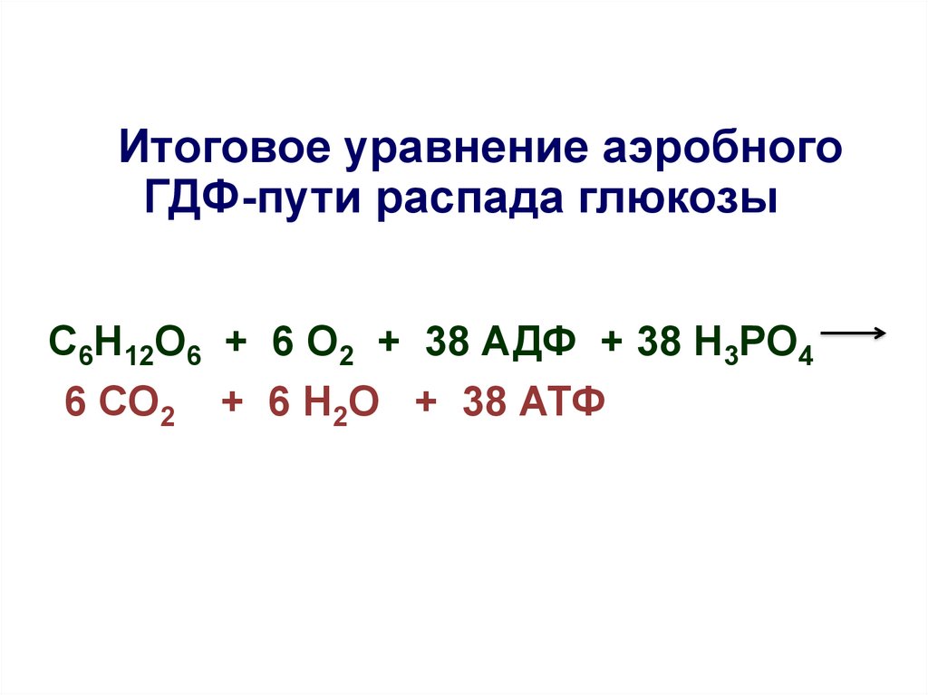 36. Итоговое уравнение аэробного ГДФ-пути распада глюкозы