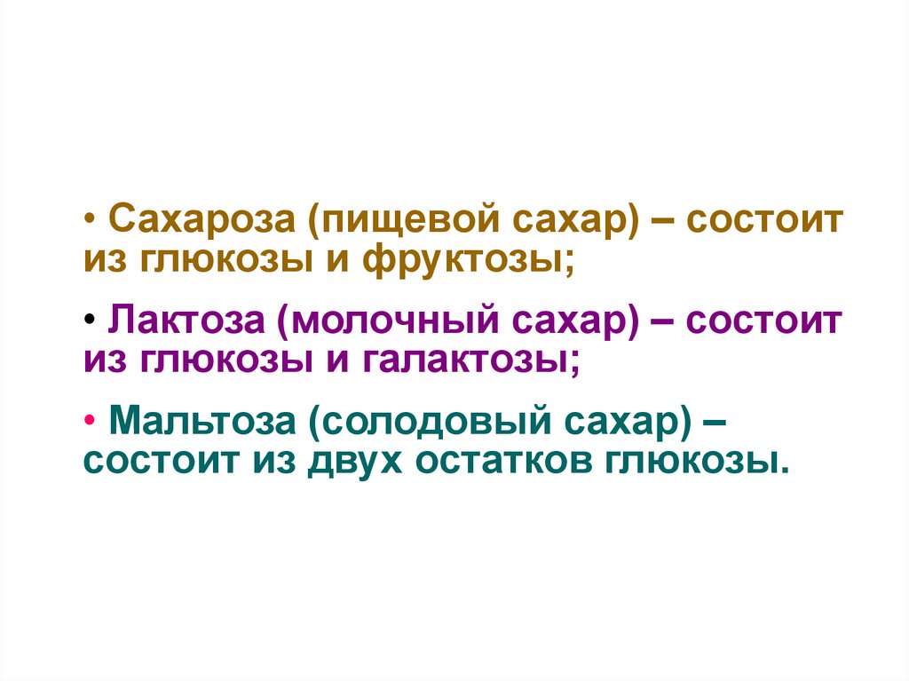 • Сахароза (пищевой сахар) – состоитиз глюкозы и фруктозы;