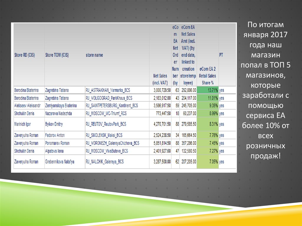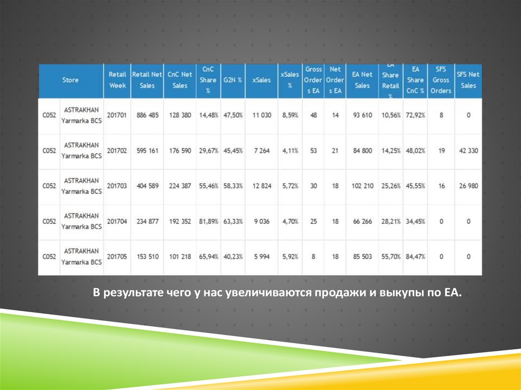 В результате чего у нас увеличиваются продажи и выкупы по ЕА.8. Что нам помогло достичь таких результатов