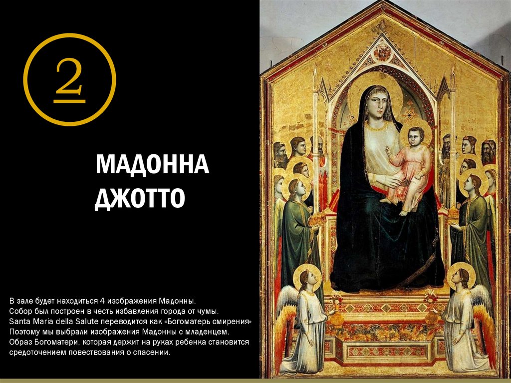 Повторюсь, собор был построен в честь избавления города от чумы.Santa Maria della Salute переводится как «Богоматерь смирения»