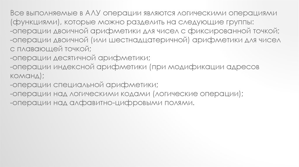 Все выполняемые в АЛУ операции являются логическими операциями(функциями), которые можно разделить на следующие группы:
