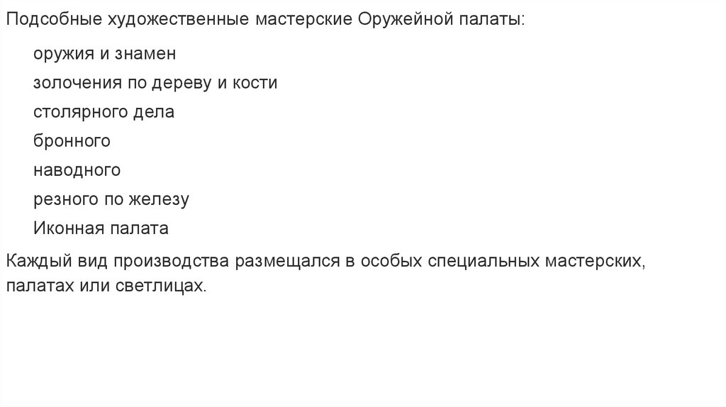 Предшественником мастерских Оружейной палаты была мастерская палата Ивана Грозного. Во 2й пол. XVII века Оружейная палата становится центром общерусского изобразительного искусства,в стенах которой объединились художественные силы, существовавшие до этого на Руси лишь в