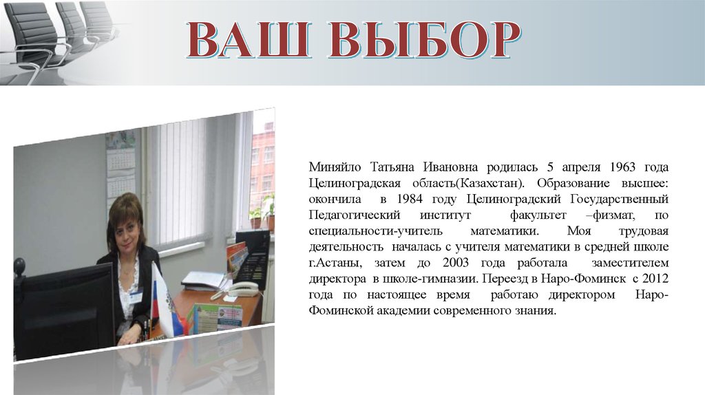 Миняйло Татьяна Ивановна родилась 5 апреля 1963 годаЦелиноградская область(Казахстан). Образование высшее: