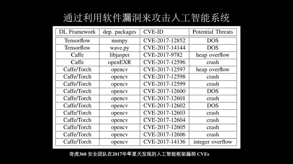通过利用软件 洞来攻击⼈工智能系统奇虎360 安全团队在2017年 夏天发现的⼈工智能框架漏洞 CVEs