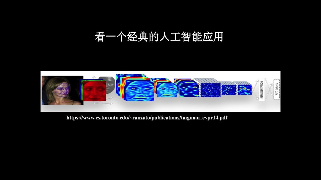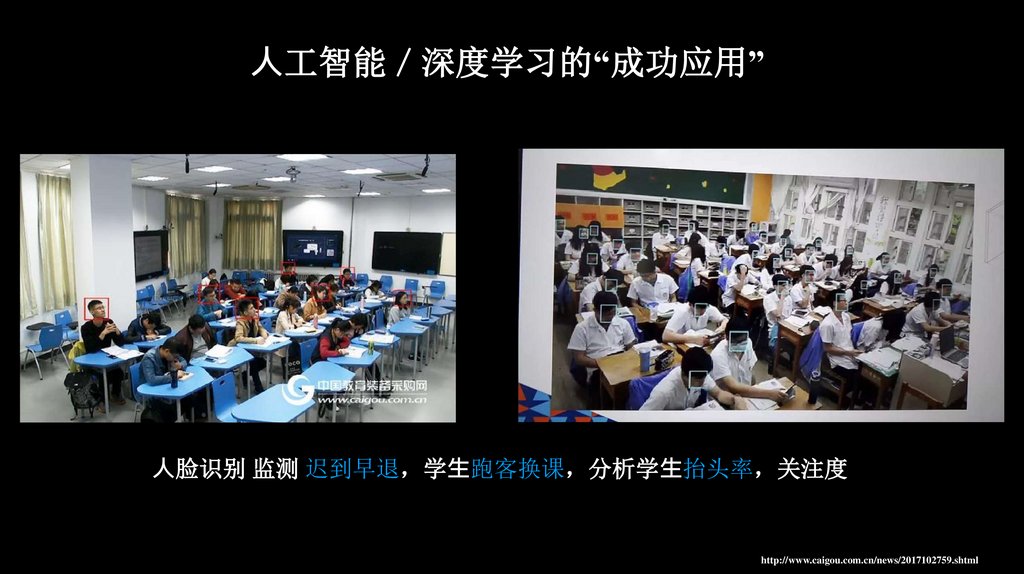 ⼈工智能 深度学习的“成功应用”⼈脸识别 监测 迟到早退 学⽣跑客换课 分析学⽣抬头率 关注度