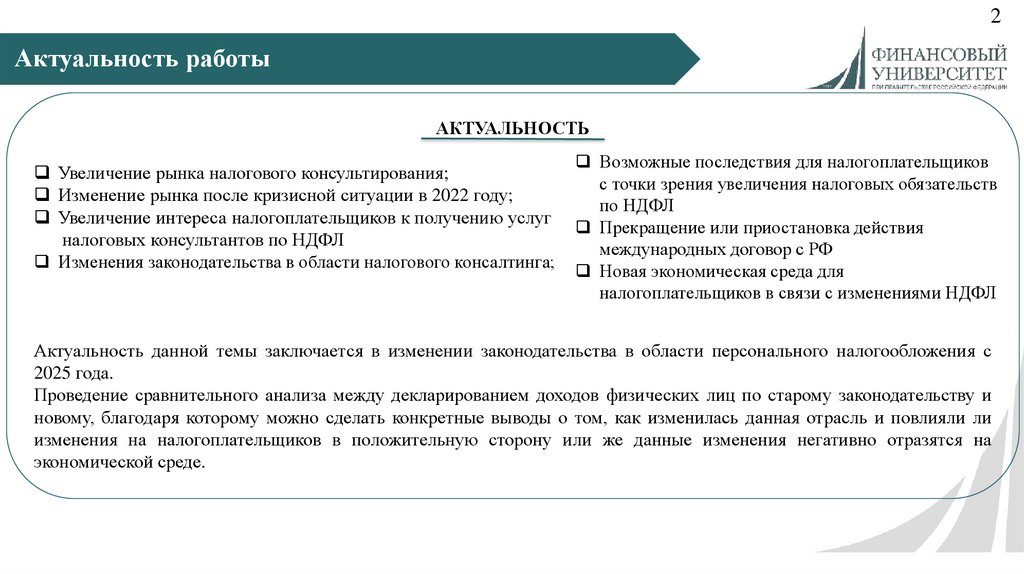 Актуальность данной темы заключается в изменении законодательства в области персонального налогообложения с