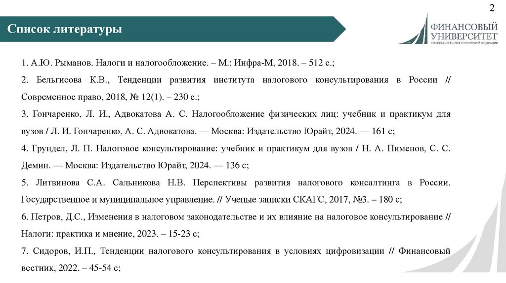 4. Грундел, Л. П. Налоговое консультирование: учебник и практикум для вузов / Н. А. Пименов, С. С.