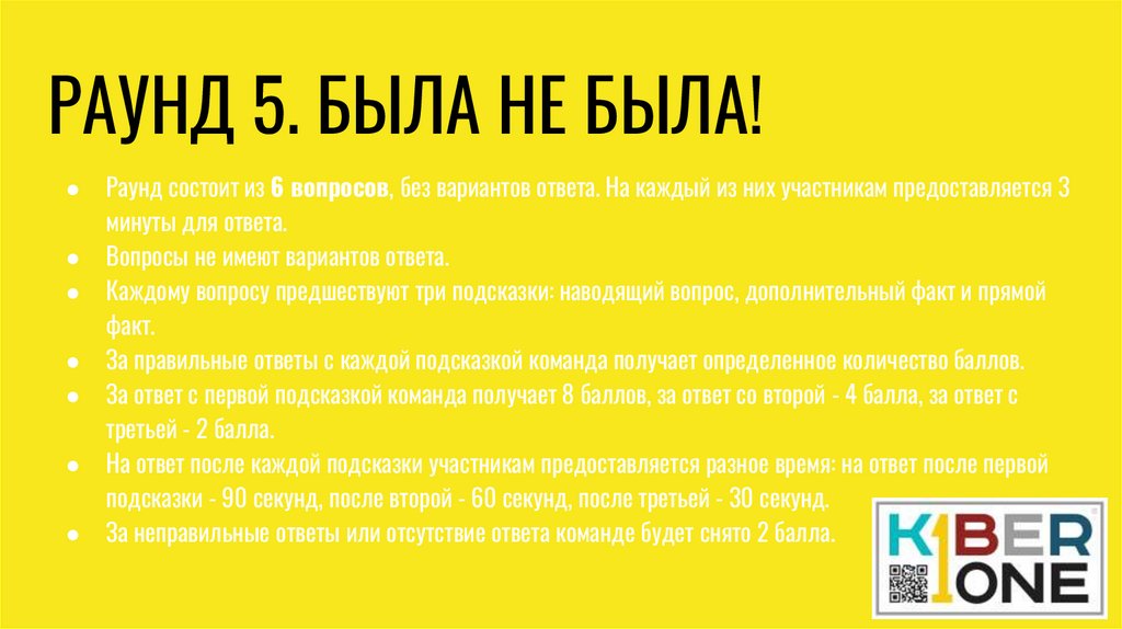 РАУНД 5. БЫЛА НЕ БЫЛА!Раунд состоит из 6 вопросов, без вариантов ответа. На каждый из них участникам предоставляется 3