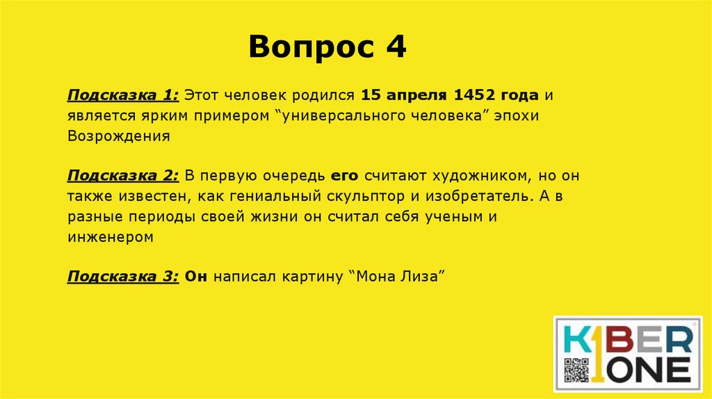 Вопрос 4Подсказка 1: Этот человек родился 15 апреля 1452 года и