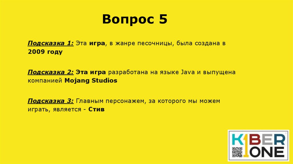 Вопрос 5Подсказка 1: Эта игра, в жанре песочницы, была создана в