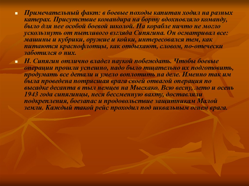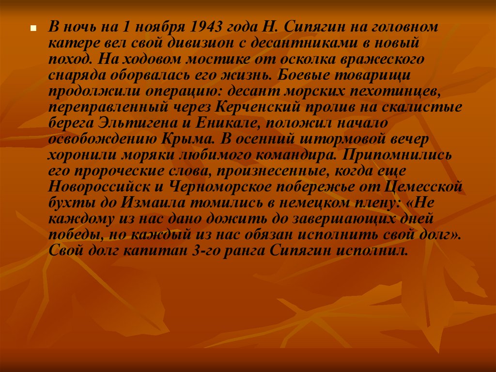 В ночь на 1 ноября 1943 года Н. Сипягин на головномкатере вел свой дивизион с десантниками в новый