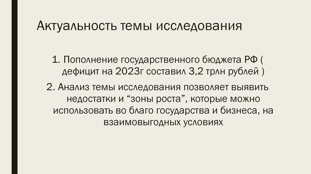 Актуальность темы исследования1. Пополнение государственного бюджета РФ (