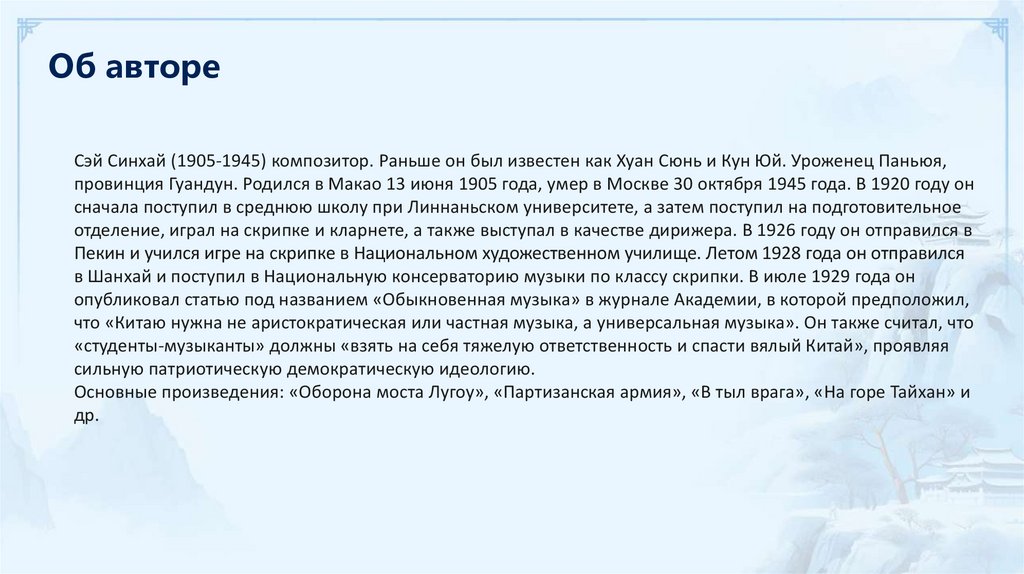 Об автореСэй Синхай (1905-1945) композитор. Раньше он был известен как Хуан Сюнь и Кун Юй. Уроженец Паньюя,