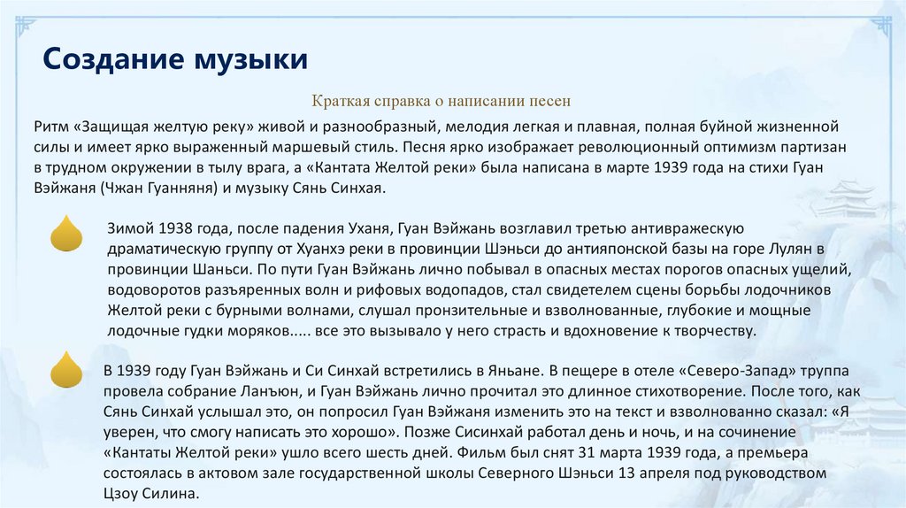 в трудном окружении в тылу врага, а «Кантата Желтой реки» была написана в марте 1939 года на стихи Гуан