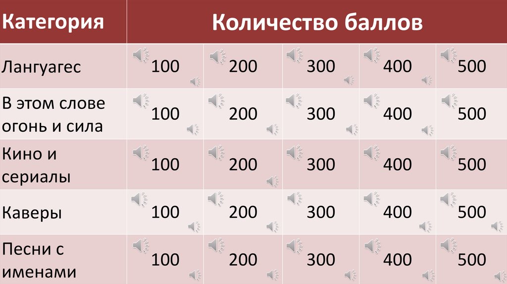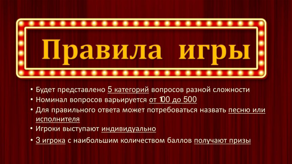 • Будет представлено 5 категорий вопросов разной сложности• Номинал вопросов варьируется от 100 до 500