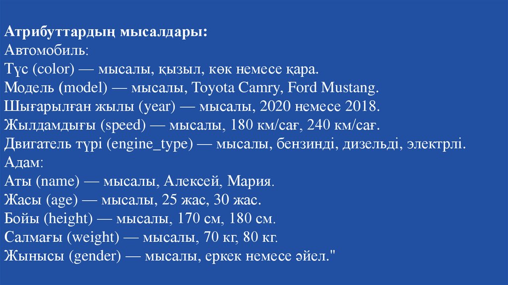 Мысалы: автомобиль объектісі сипаттамаларына (түс, модель) және