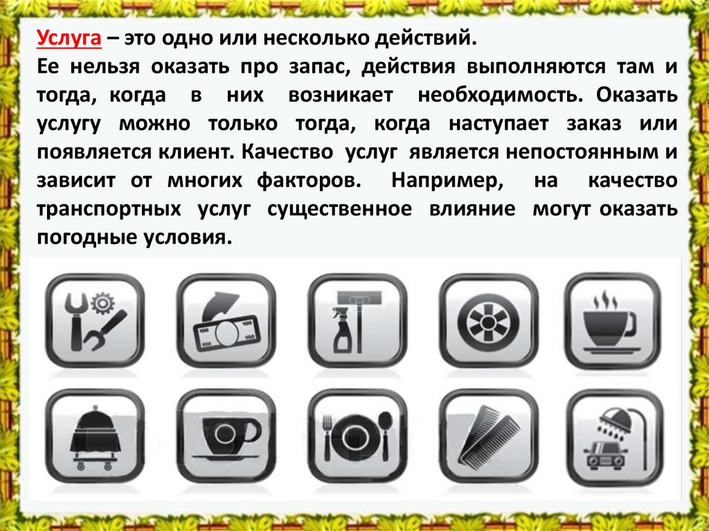 Услуга – это одно или несколько действий.Ее нельзя оказать про запас, действия выполняются там и