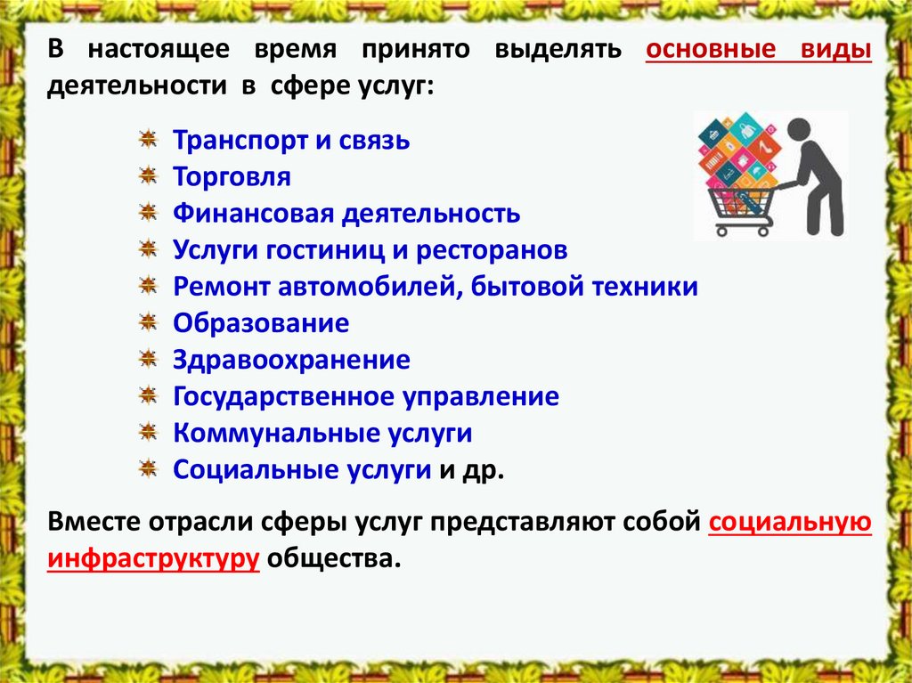 В настоящее время принято выделять основные видыдеятельности в сфере услуг: