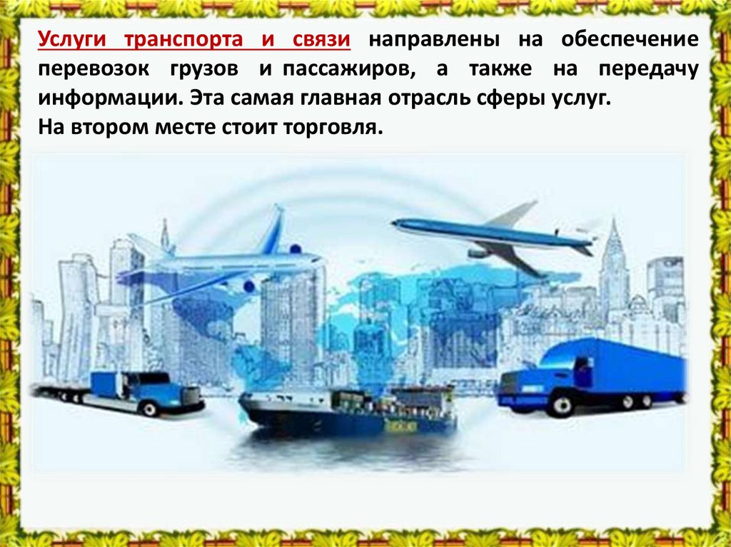 Услуги транспорта и связи направлены на обеспечениеперевозок грузов и пассажиров, а также на передачу